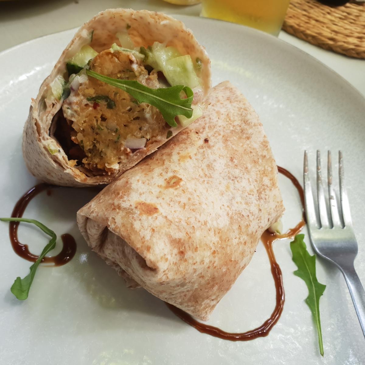 This is an incredibly tasty wrap. The falafels are soft and well spiced, the vegetables are crunchy and the vegan tzatziki really pulled everything together. I would definitely get this again. #veganisnotscary