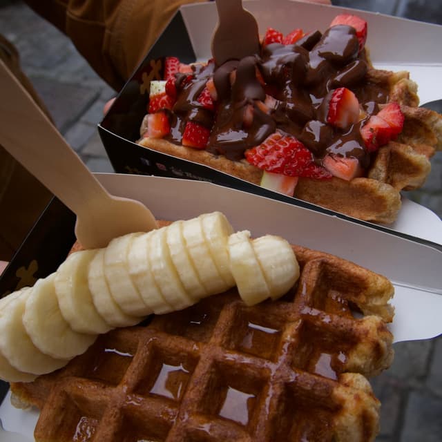 Amazing vegan AND Gluten free waffle! I took one strawberry and chocolate and one banana and maple syrup. They also got vegan hot chocolate