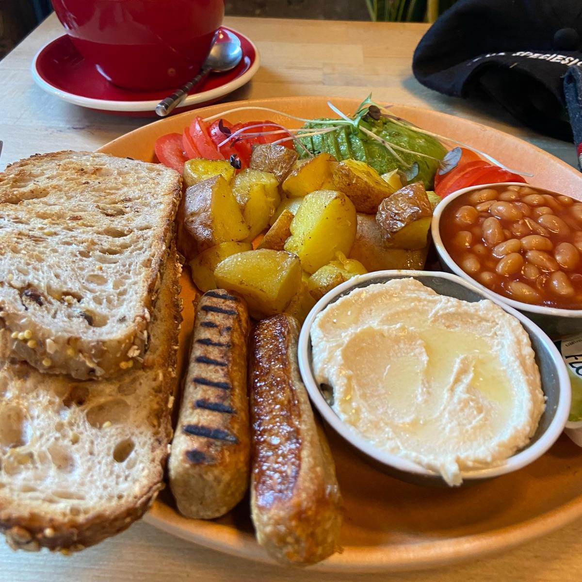 Vegan sausages, baked beans, roasted tomatoes and potatoes, avocado, and hummus and sourdough. Quite the feast, too much for me in fact. I’ll be sure to bring a take away box next time, or perhaps some company.