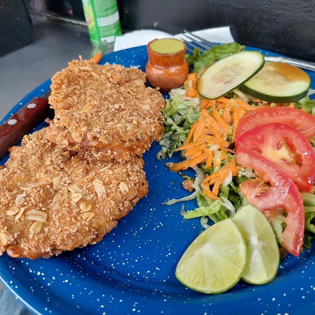 ¿Hay algo que no sea delicioso en María Bonita? Esta milanesa de avena, con calabacita y zanahoria, fue parte de un Menú del Día (que incluye ensalada, sopa y agua) por lo que no está disponible todos los días. Muy nutritiva y tiene muy buen sabor; es un poco seca pero viene con una salsita verde para remediarlo. El acompañamiento de la ensalada es genial.