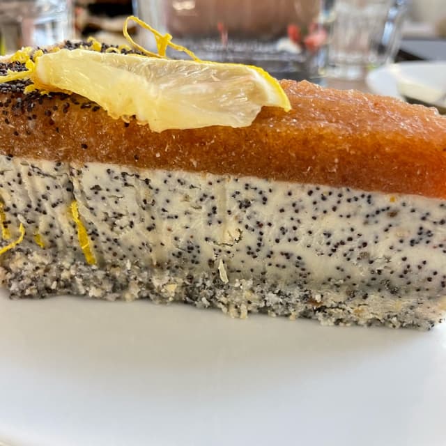Torta fresca tipo cheese cake con limone e semi di papavero. Buonissima, l’amaro della marmellata al limone è compensato dalla dolcezza della crema. Circa 6€ 💸