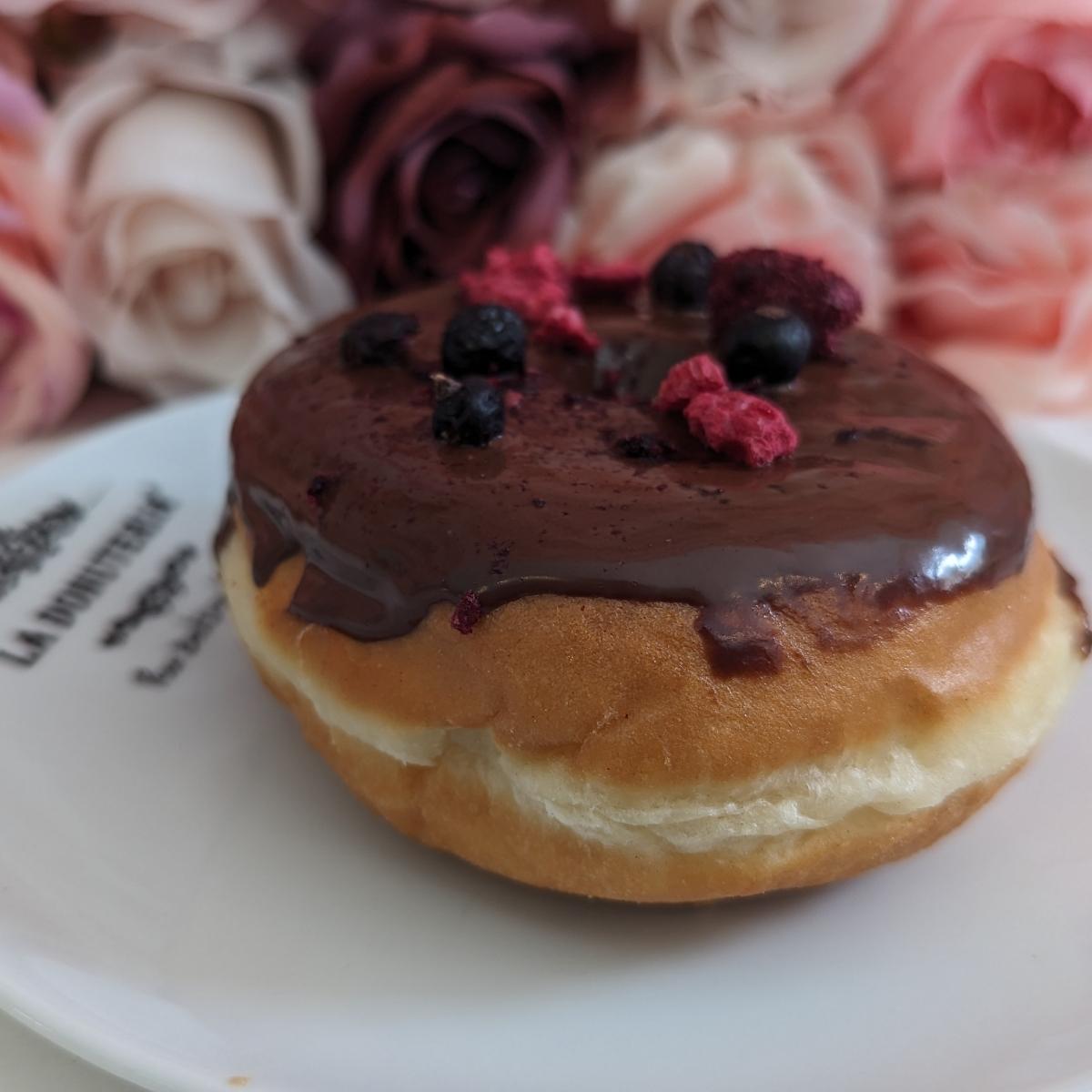 Ciambellona vegana, con sopra una colata di cioccolato fondente poco amaro, decorato con frutti di bosco essiccati. La nota acidula dei frutti è davvero piacevole col contrasto del cioccolato.
