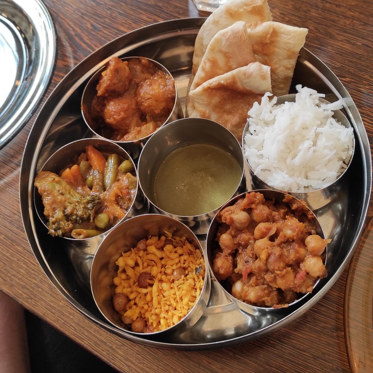 Nice and healthy vegan options for lunch. Vegan naan bread, rice, spicy potatoes, chickpeas masala, vegetables curry, spicy sauce.
