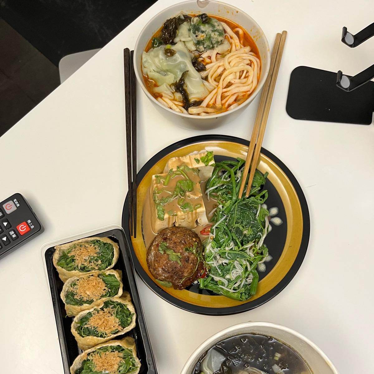My favorite dish — flavorful veggie filled broth with six little wontons and a generous helping of noods.