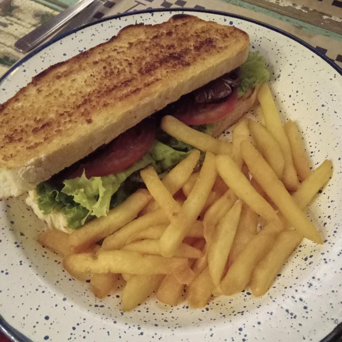 RIQUÍSIMO este sándwich de hongos portobellos y berenjena. Viene con una porción de papas fritas, no muy abundante pero con el tamaño del sándwich te llena re bien. Tienen otra opción veg de palta. Muy recomendable, además te atienden súper amables.