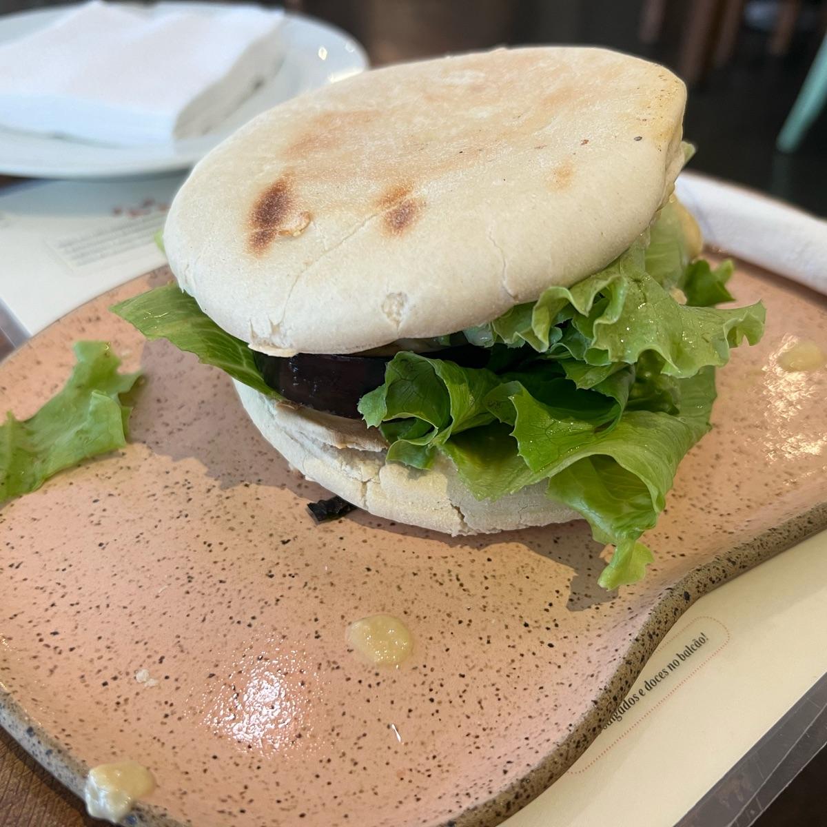 Pão sírio com beringela grelhada, rúcula e hommus. Bem saboroso!