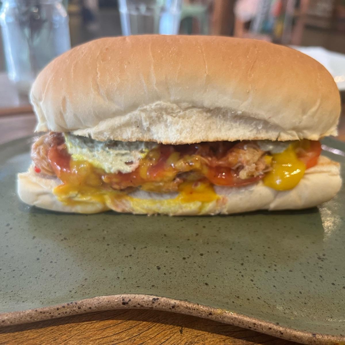 Pão tipo de hotdog sem leite, salsicha de soja, jaca desfiada, veganese, catchup, mostarda e tomate. Muuuuuito saboroso