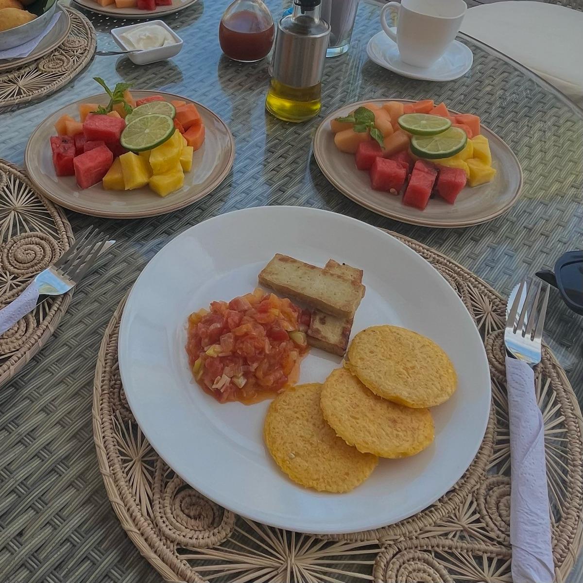 Riquísimo! Un desayuno súper balanceado, completo y abundante. Trae mini arepas de maíz, salsa “hogao” y tofu (para la proteína jeje). Viene acompañado de frutas y una bebida como jugo de naranja🥰