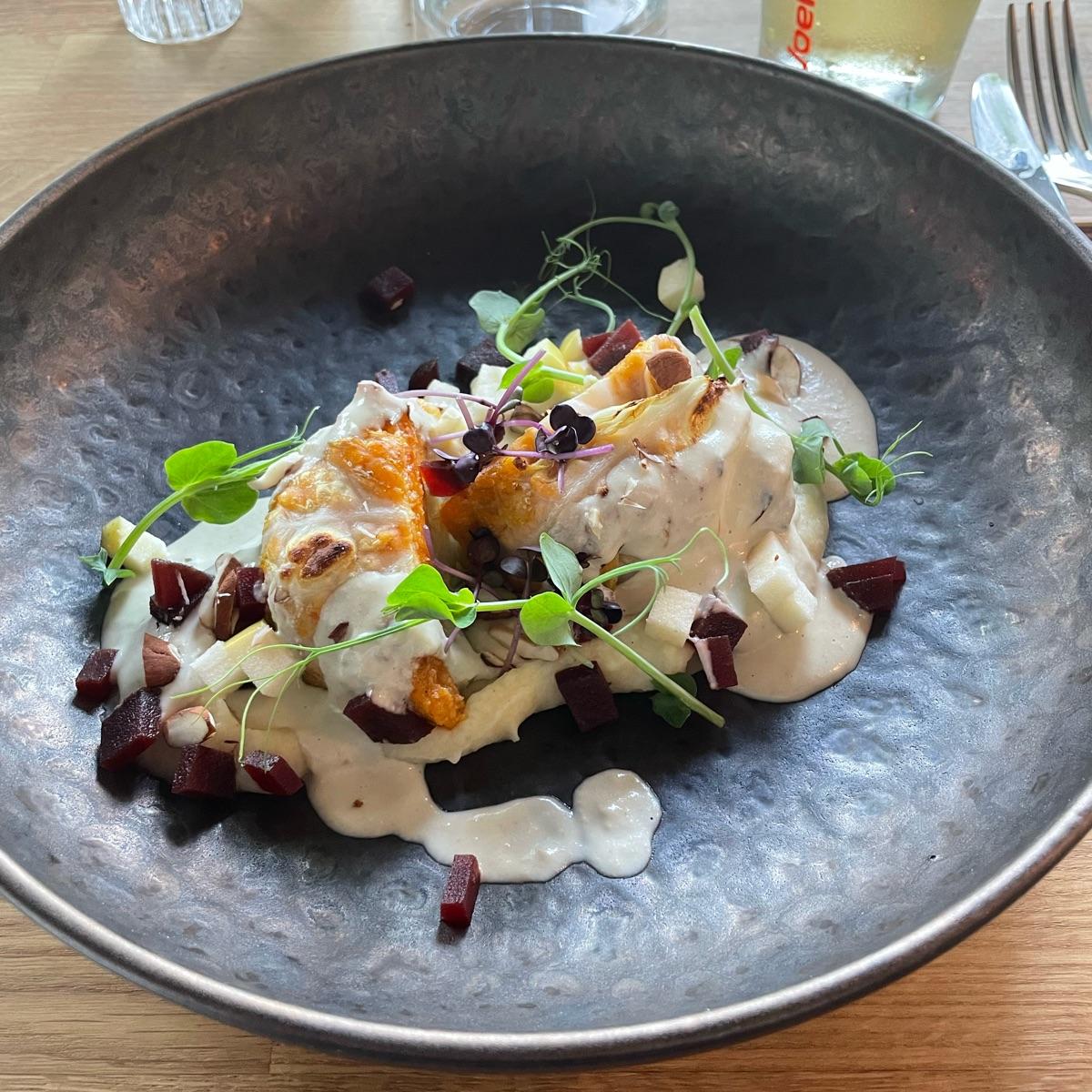 Savoy cabbage filled with cream cheeze, beetroot , almonds and parsley root sauce 😍 Very nice combination once more - I could eat the whole menu from #jonathangebhardt 🫶🏼 - 21€ #finedining #veganfinedining #lübeck #veganinschleswig-holstein #schleswig-holstein #veganschleswig-holstein #eattherainbow