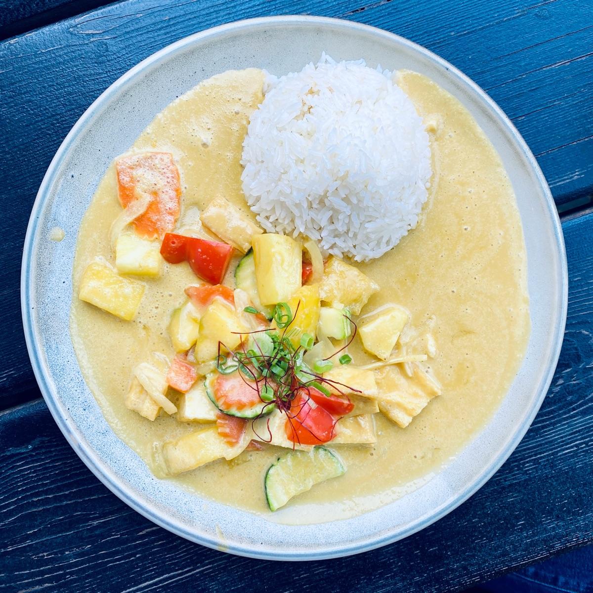 This green coconut 🥥 curry came with tofu, seitan and a ton of veggies and of course steamed rice! It was only €9.50 which included jasmine passionfruit ice tea.