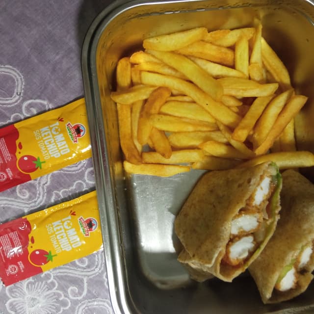 Green dot crunchy fillet wrap $9.50 even the tomato sauce ingredients are all vegan including regulators, thickeners, stabilisers. However I would give this dish a 5/10 because It's nothing spectacular. We can make this at home with some wholemeal wraps+vegan fish sticks and lettuce and tomato sauce.. They don't even add vegan cheese..well, we can, can't we??