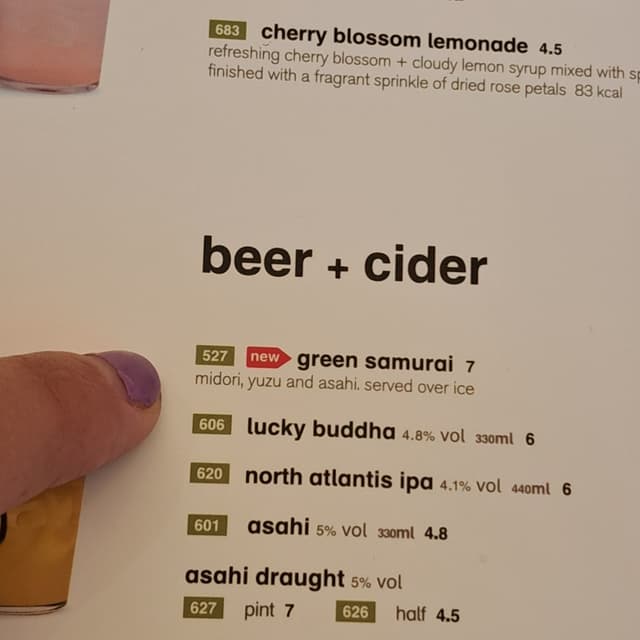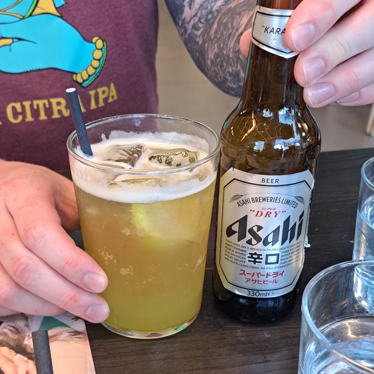 Jesse got this drink. It was midori, yuzu and ashai #beer. It came with #ice. Jesse said he didn't mind it. It was £7. It has the #vegan symbol beside it.