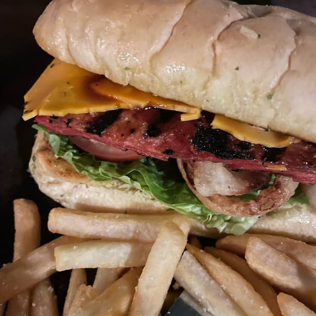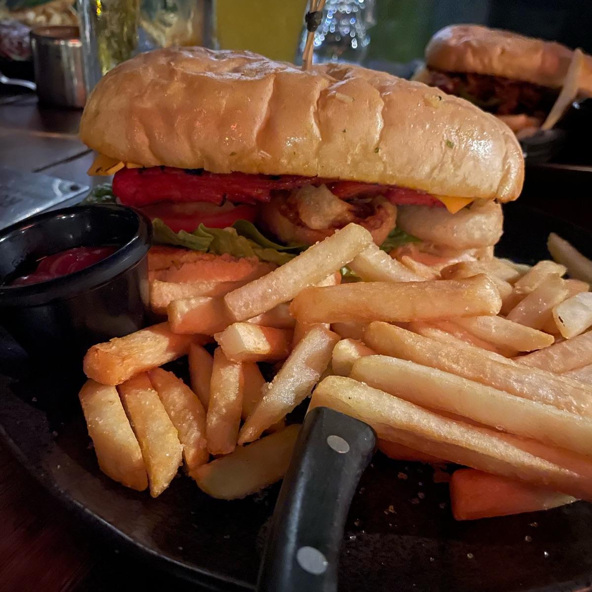 What I do remember is that it was very tasty and satisfying af. And massive! I contemplated calling it off and taking the other half home as leftovers, but after a breather I managed to finish it off 🥲 The “steak” part wasn’t particularly reminiscent of steak but was very good in itself. Lettuce, tomato, cheeze and onion rings completed this monster of a sandwich. Normally $28, bjf was only $20 as we ate here on Wednesday night “Steak Night”.
