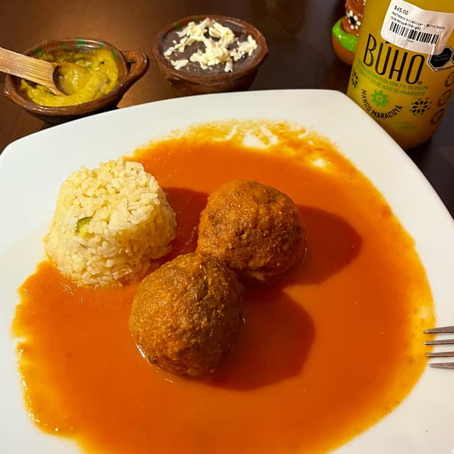 Albóndigas de soya, arroz y rellenas de tofu en caldillo de jitomate. De guarnición arroz y frijoles refritos. La verdad las esperaba más ricas porque cocinan muy rico aquí pero estaban medio simples además de algo pequeña la porción. La salsa no pica y te dan tortillas echas a mano. Por el momento no las volvería a pedir, prefiero seguir explorando más opciones de su carta 👀🎃👻 #veganisnotscary #veganmeatballs #veganmexicanfood #govegan #meatisscary