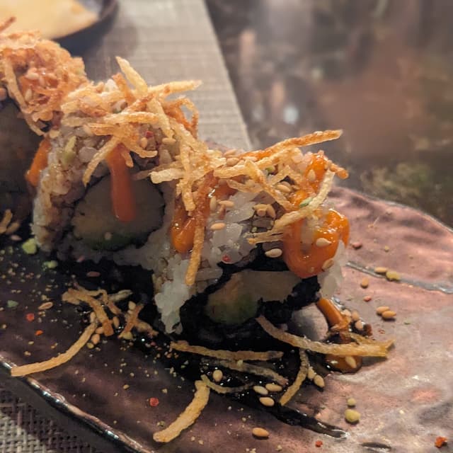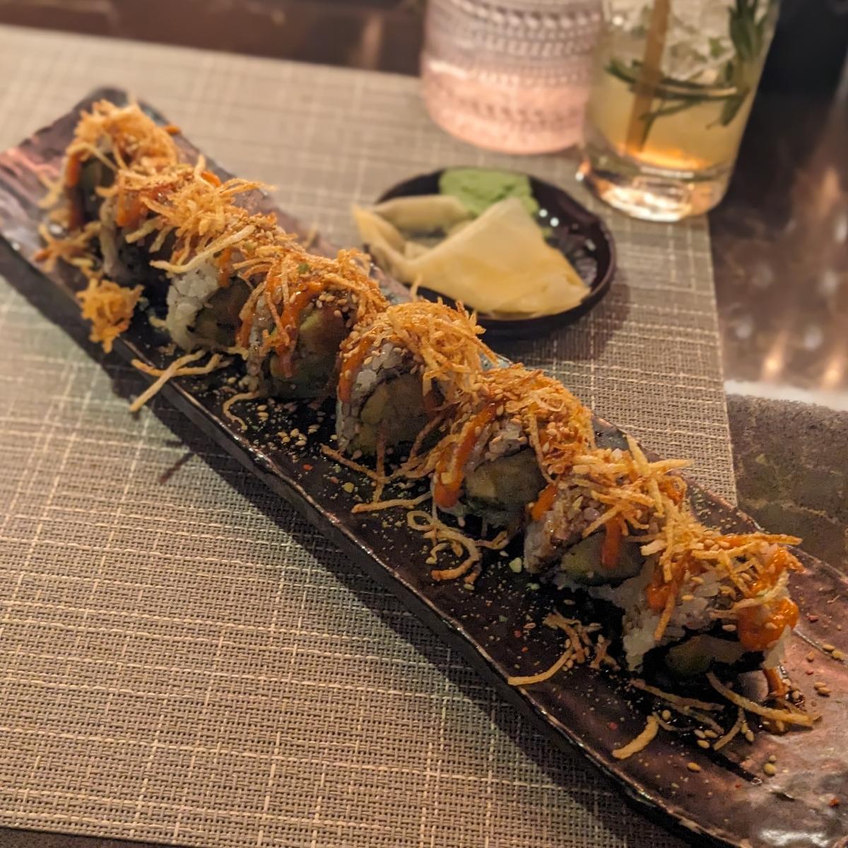 This sweet potato-forward roll was a great choice. It's made of japanese sweet potato, avocado, unagi, potato straws, gochujang mayo, and chili salt. The sweet potato and avocado were nice and creamy. It paired well with the potato straw crispy bits on top. The sauce was really delicious. It wasn't spicy like I thought it might be, but it did pack a lot of flavor.