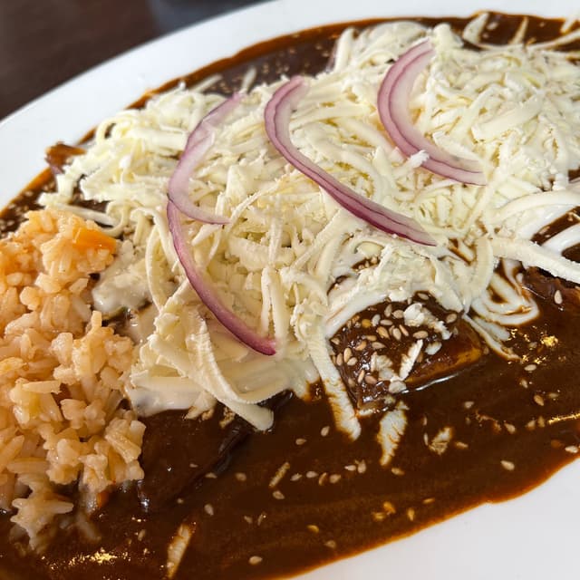 Me gustaron mucho estas enchiladas de mole, van rellenas de plátano macho y decoradas con crema, queso y cebollita, lo mejor es que no estaba muy picosas. El arroz de guarnición estaba muy rico también y con sabor muy casero. Bastante llenadoras y recomendables #veganenchiladas #veganmexicanfood #veganinmexico #veganfortheanimals #ifitsnotveganitsnotfood