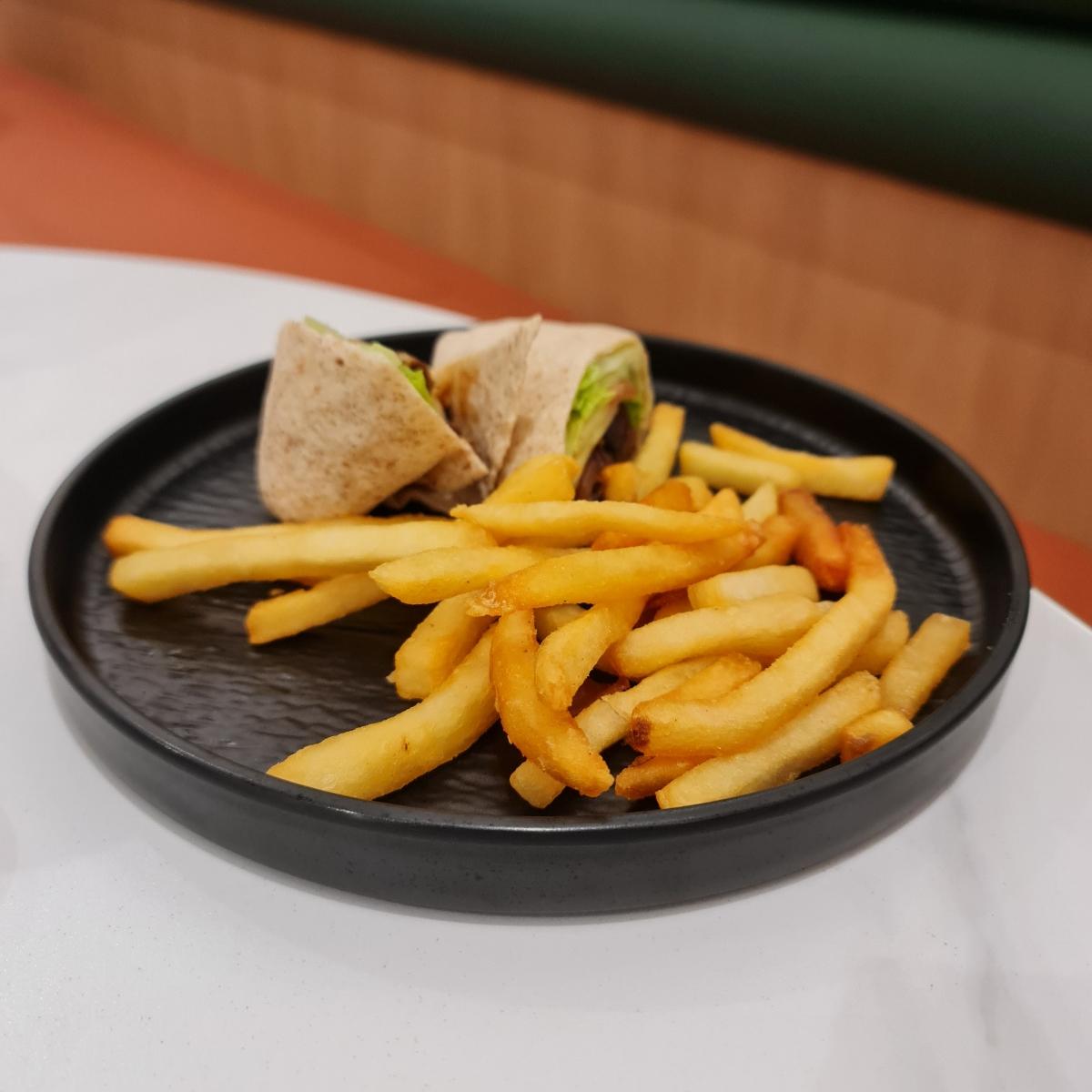 $10 for a desert -dry platter with the standard #fries (in abundance) + tiny #wrap of even tinier strands of #teriyaki #mushrooms accompanying #eatyourgreens. All I tasted was dough. Good stuff to #carbsforlife ratio a 2 to 8