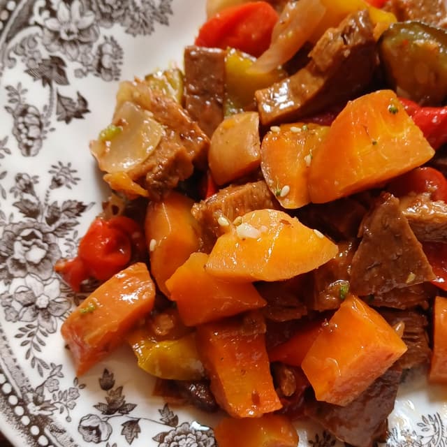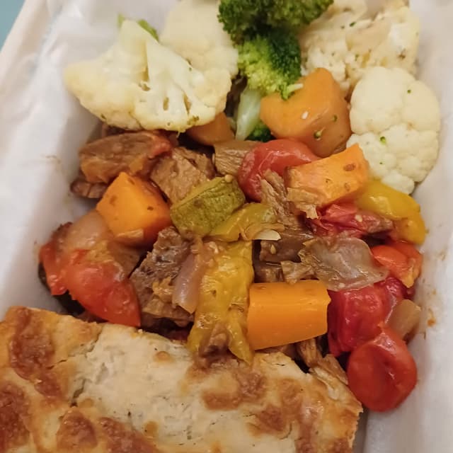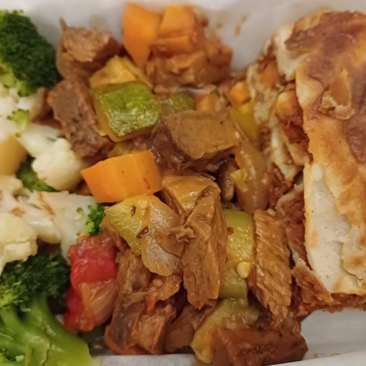 Questa Ciccia Marchigiana invece non l'avevo mai provata. Non so se fosse home made o se si tratti del prodotto omonimo, vegan e biologico, commercializzato da Tutt'altro. É fake meat a base di lenticchie e glutine di frumento e si presenta in bocconcini tipo spezzatino. Come sapore assomiglia a un buon seitan. In questo caso é stato cucinato con zucchine, peperoni e carote (quest'ultime un pó indietro di cottura). L'ho apprezzato in un piatto unico con lasagne e 2 tipi di cavolo.