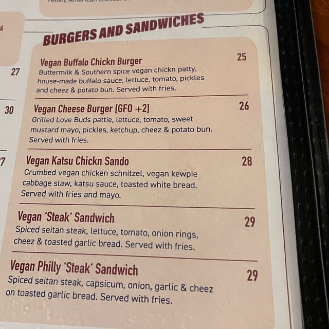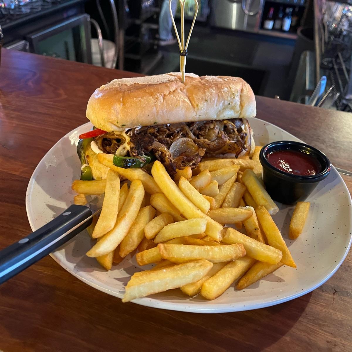 This 'steak' sandwich was something different! Cheez, spiced seitan steak, grilled capsicum, onion, garlic on toasted garlic bread. Served with fries. This is such a nice pub; really nice staff and of course, lots of vegan options.