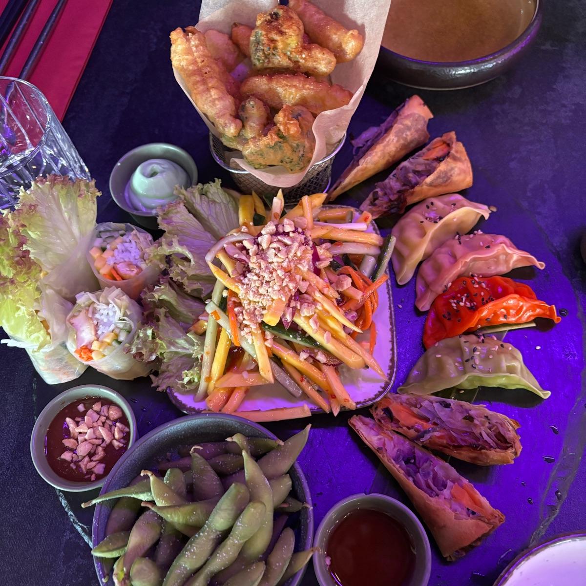 Al centro insalata di cetrioli, mango e carote condita con salsa agrodolce e arachidi; edamame salati; involtino vietnamita di verdure; ravioli al vapore di verdure; tempura di verdure; rolls di riso, verdure e tofu avvolti in fogli di riso. Per ogni assoggio c’è una salsa abbinata. Tutto buono, i ravioli davvero pltre ogni aspettativa 🥟🤤
